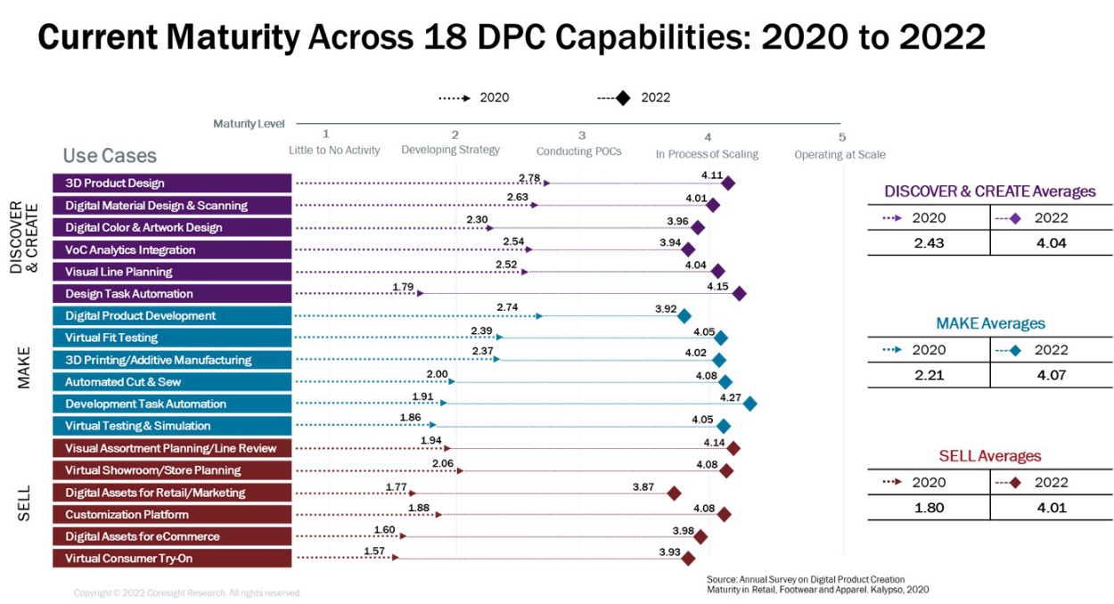 What surprised our team was the extent to which “Make” and “Sell” capabilities also accelerated as brands looked for ways to leverage 3D and digital across their full value chain. In the “Make” space, brands looked for new digitally enabled ways to collaborate with their factory partners in lieu of traveling and using physical prototypes. In the “Sell” category, brands accelerated their use of rendering technologies to share products and experiences with wholesale customers and consumers. The data collected on “Sell” capabilities also captured some of the intense hype over the last 18 months around digital products (NFTs) and metaverse technologies.