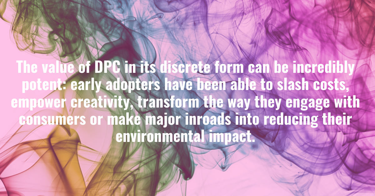 In many ways, this is expected. The value of DPC in its discrete form can be incredibly potent: early adopters have been able to slash costs, empower creativity, transform the way they engage with consumers or make major inroads into reducing their environmental impact. However, the difficulty now comes from doing all those things at once.