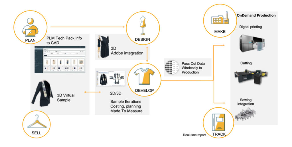 Whether you’re producing a limited run in a nearby city, or sending a larger order overseas, the same technologies and the same principles can deliver comparable results. Both models rely on using algorithms to predict trends and demand curves, and then leveraging this information to drive digital product development that can be constantly refined and collaborated on in a virtuous loop of 2D pattern design and 3D simulation. The micro and macro-scale factories of the future both heavily feature automation, whether it’s feeding an eCommerce order directly into the production queue, or using telematics and dashboards to oversee assembly and finishing, and monitor delivery timelines from a continent away.