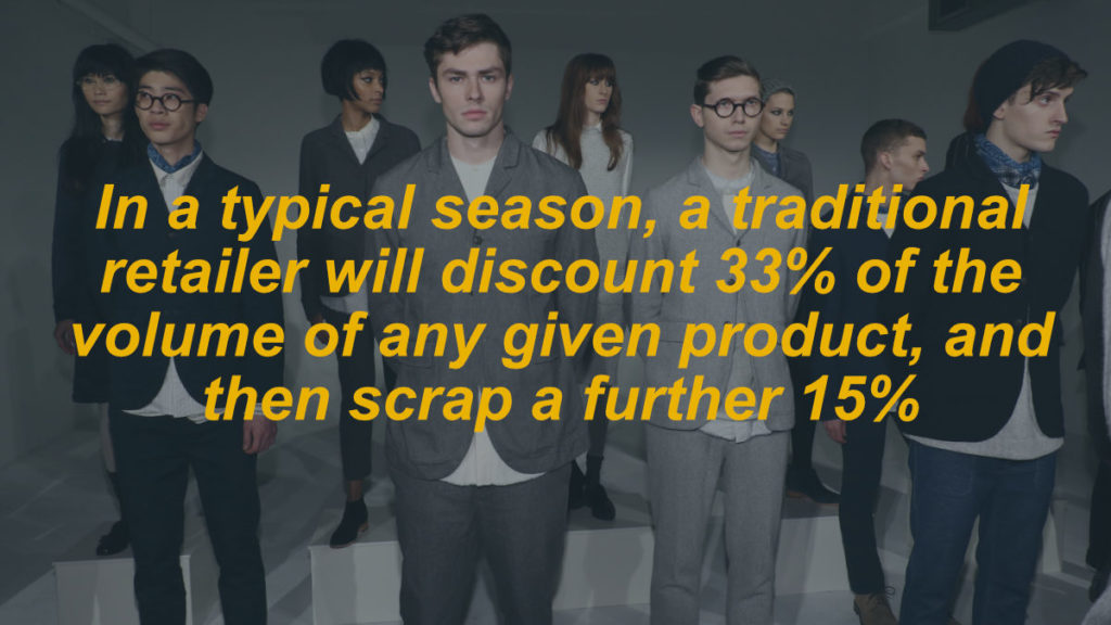 The scale of this is unprecedented, but the concept of holding excess inventory that did not sell-through at full price, and following a strategy for discounting or repositioning it to sell at a reduced pricepoint is not new. In fact, it’s been fundamental to the workflows and cultures that have shaped fashion and retail for a century or more. In a typical season, a traditional retailer will discount 33% of the volume of any given product, and then scrap a further 15%. So in practice only a slim majority of the apparel, footwear, and accessories made are sold at their target price.