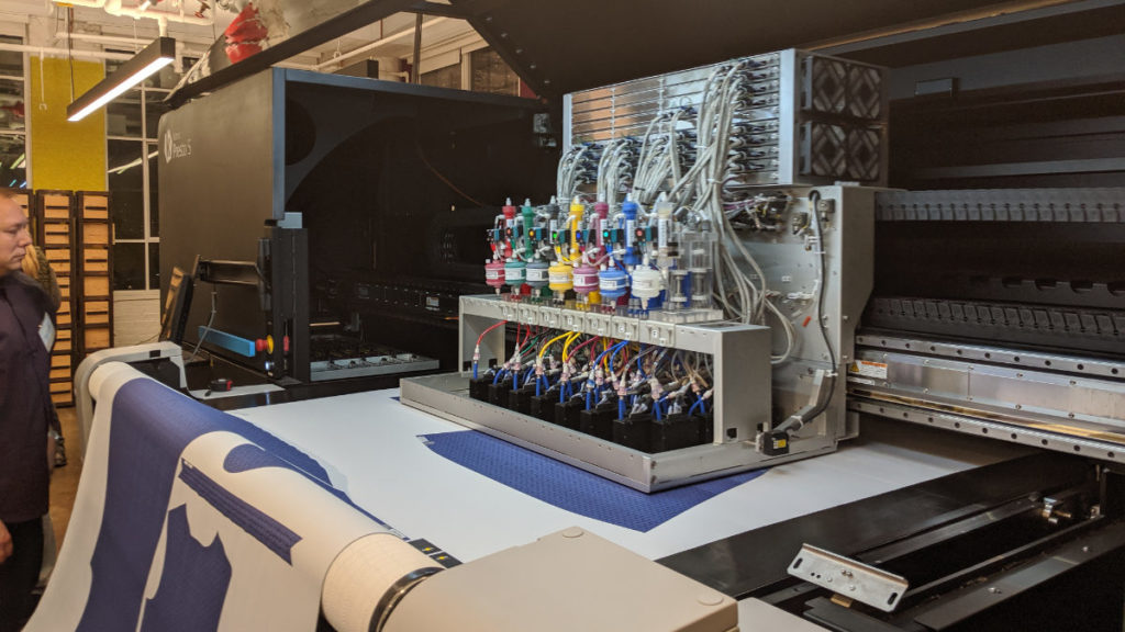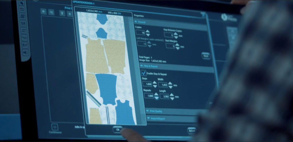 Once the order has been automatically sense-checked against clear, pre-agreed criteria, those patterns are then printed using a Kornit Digital Printer, which uses water-based pigment printing to produce fabric on-demand with zero toxic waste and no requirement for any inventory besides greige. The printed and marked fabric is then passed through a dryer and on to a Gerber single-ply cutting machine, which uses a computer vision system to detect and cut pattern outlines before sewing and final assembly – both of which are done on-site.