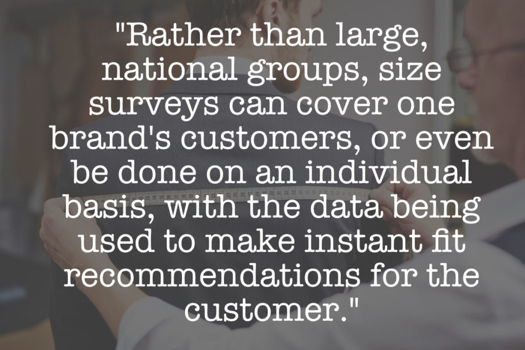 This, in my opinion, is where the future of sizing surveys lies. Rather than national surveys of large population groups, they can be linked to retailers or a brands customers or even on an individual basis, with the resulting data being used to make instant fit recommendations for the customer who scans themselves – as well as continuously tweak the block patterns to improve overall fit across the retailer’s entire range.