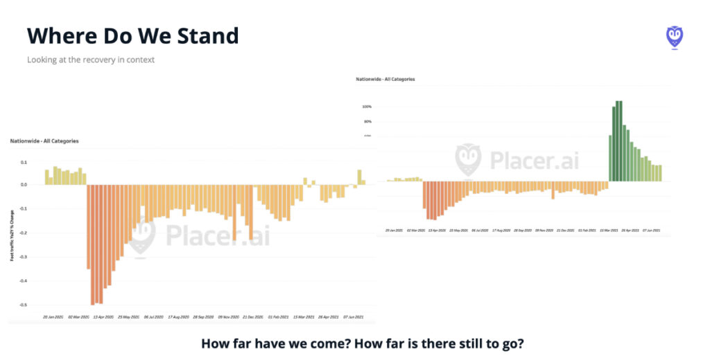 Here, on the left, we have a year over two year comparison, looking at weekly data for overall retail visits throughout the United States, compared to the equivalent week in 2019. Whereas the right-hand chart represents the same numbers as compared to 2020. And this is where the conflicting ideas that either everything is better than it’s ever been, or that we have a long way to go, come from.