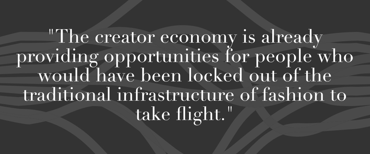 For fashion, this could prove to be a quiet watershed moment. Whether the creators they choose to support are influencers creating niche looks by pairing items from existing product catalogues, hobbyists upcycling or reclaiming clothing on the secondary market, or emerging creatives customising or designing their own styles, the creator economy is already providing opportunities for people who would have been locked out of the traditional infrastructure of fashion to take flight.