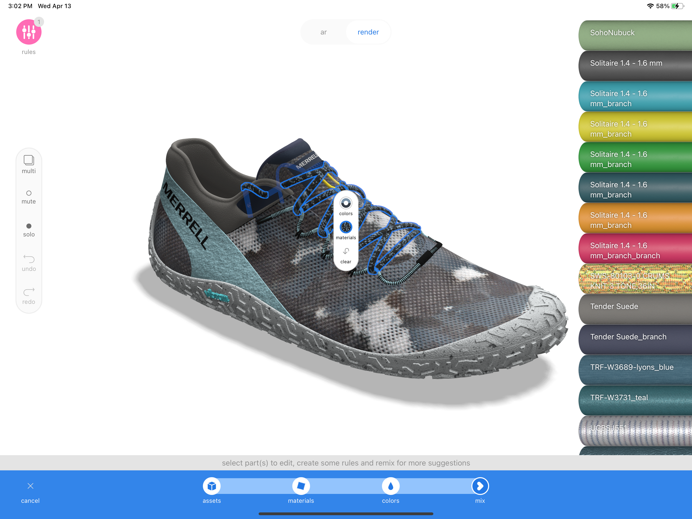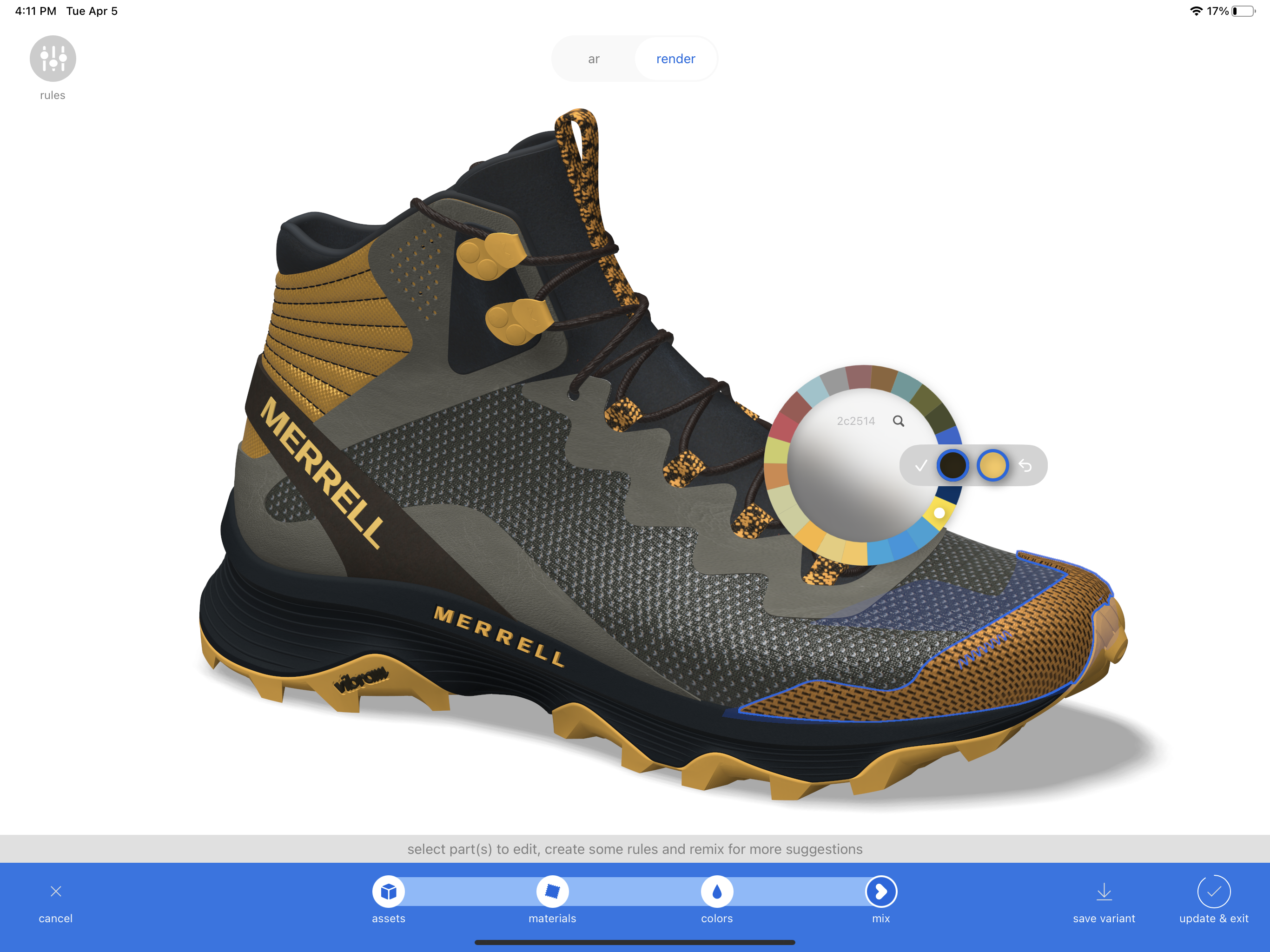 “swatchbook has revolutionized digital product creation and material management,” says John Burch, Senior Vice President of Product for Merrell, a Wolverine Worldwide brand. “swatchbook and mix enable our teams to sandbox ideas with decision-makers before releasing projects to development partners in a digital tech pack format within the confines of our approved material and color palette enabling Merrell to go to market faster, drive innovation, and operate more sustainably.”