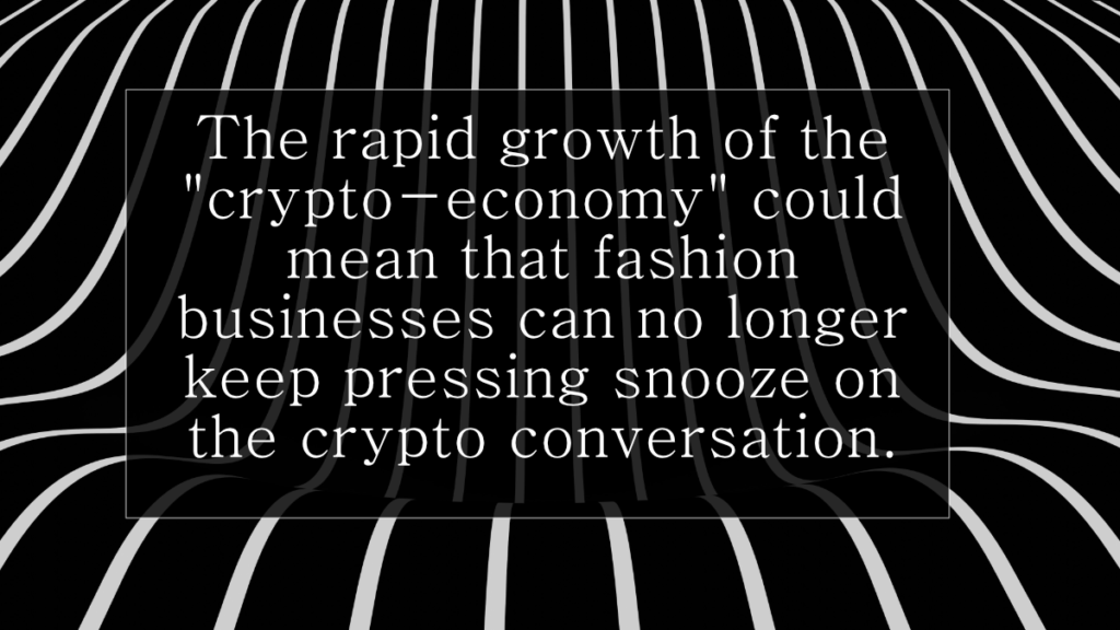 Coinbase CEO Brian Armstrong believes that, by 2032, 1 billion people will use or have tried to use cryptocurrency. If Armstrong’s prediction is to be believed, then the rapid growth of the “crypto-economy” could mean that fashion businesses can no longer keep pressing snooze on the crypto conversation. It seems the time has come to take it all seriously, especially since it has been reported that cryptocurrency adoption has already overtaken early internet adoption.