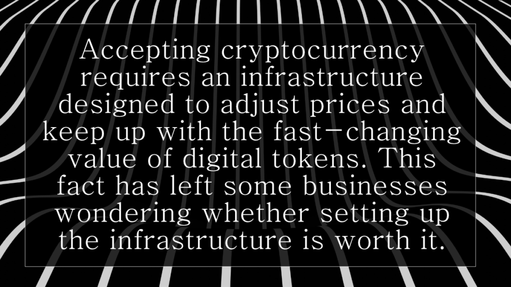 Accepting cryptocurrency requires an infrastructure designed to adjust prices and keep up with the fast-changing value of digital tokens. This fact has left some businesses wondering whether setting up the infrastructure is worth it.