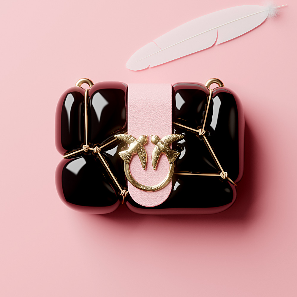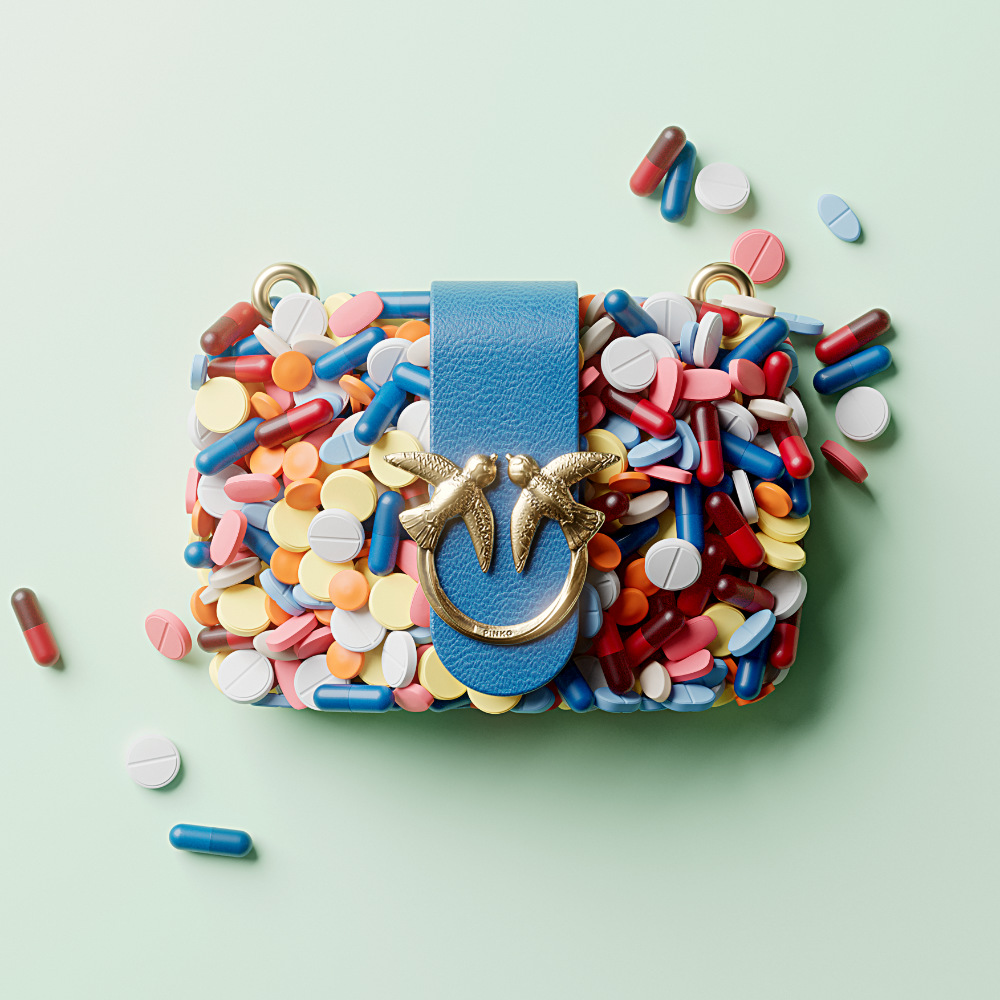 So the content opens to a “metaphysical” dimension. Different objects and shapes repeat and distribute, recreating the iconic shape of Love Bag, metaphorically held together, and contained by the two love birds. The elements derive from pop culture, even though it’s a transgressive choice of pop icons putting the overacting spirit of Pinko inside the design.