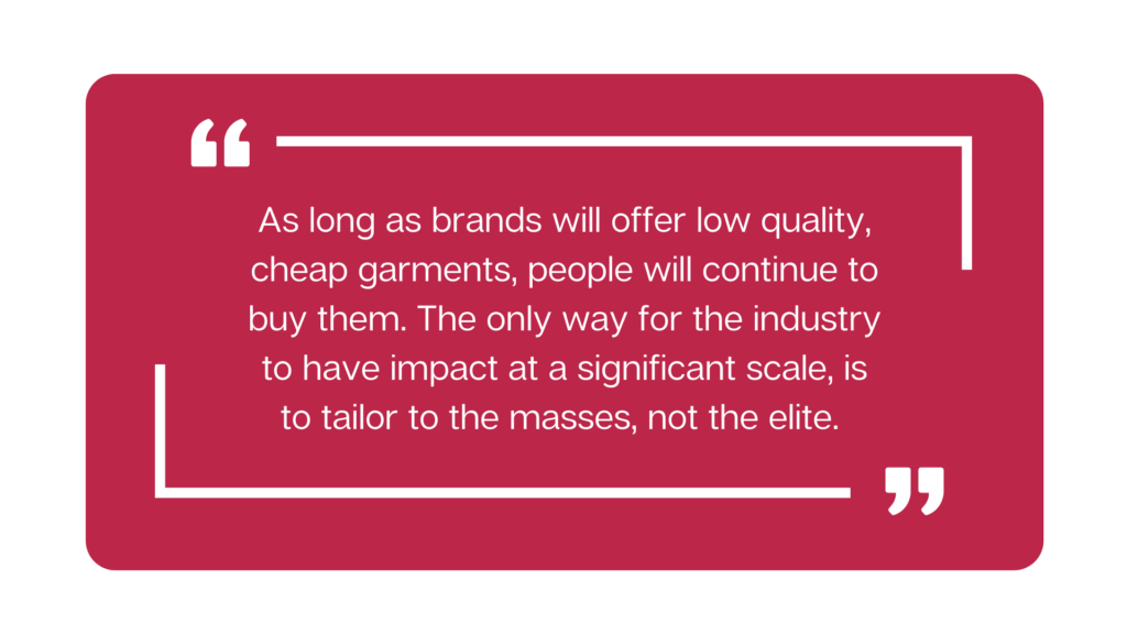 The fallacy of buying ‘fewer, better’ is an elitist approach to the (over)consumption problem. The sustainability responsibility is often placed with the customer, not the brand. ‘If people wouldn’t buy our clothes, we wouldn’t produce them anymore’. The fact of the matter is, buying ‘fewer, better’ is only available to the elite. Most people simply can’t afford sustainable brands. So they’re left with fast fashion, which is worn on average 7 times before it’s discarded. A recent article by Apparel Insider showed that 30% of second hand clothes are unusable due to their deteriorated quality. As long as brands will offer low quality, cheap garments, people will continue to buy them. The only way for the industry to have impact at a significant scale, is to tailor to the masses, not the elite.