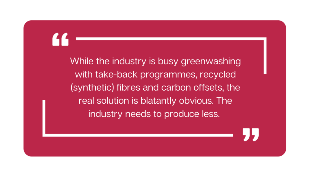 While the industry is busy greenwashing with take-back programmes, recycled (synthetic) fibres and carbon offsets, the real solution is blatantly obvious. The industry needs to produce less. 75% less to be exact, and preferably in natural fibres that survive more than 2 cycles in the washing machine.