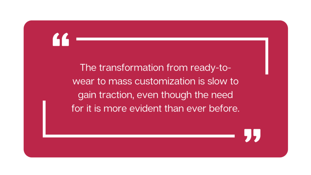 Fashion’s new buzzword is mass customization. But the reality is more unruly. The transformation from ready-to-wear to mass customization is slow to gain traction, even though the need for it is more evident than ever before. The issues with dead stock are not being resolved, rather, they’re getting worse by the day. First due to the pandemic, then by freight crisis, followed by inflation and topped off by a looming global recession. The Business of Fashion recently reported that a mind blowing 58% of garments online are on sale right now.