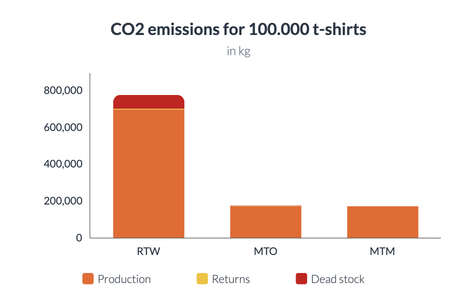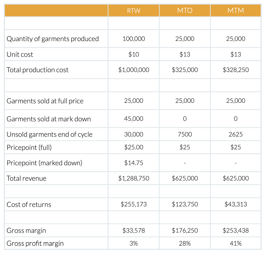 Let’s assume a RTW, MTO and a MTM brand produce 100,000 t-shirts, with unit cost being 30% higher for MTO and MTM. We’ll assume the MTO & MTM brands would allow returns.