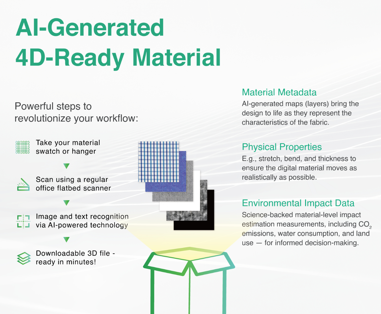 Our cutting-edge technology then transforms that 2D fabric image into a 4D-ready digital twin, which includes the fabric spec, AI-generated metadata (or maps) to ensure the digital material looks realistic, the physical properties which enable the digital material to move as naturally as it would in the real world, and a 4th level of commercial data — we are now 4D-ready!