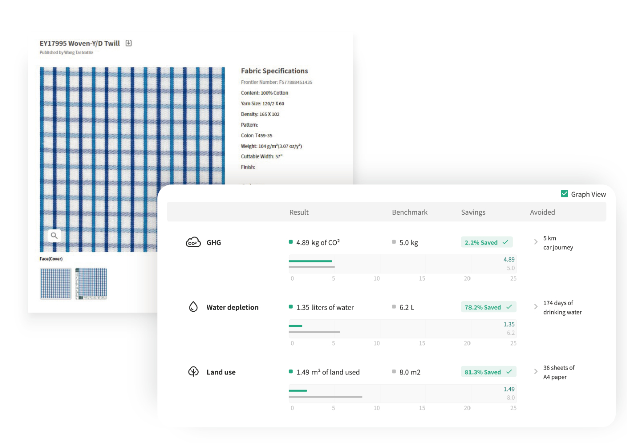 Every piece of fabric scanned and uploaded to the TextileCloudTM platform will display the estimated impact that it has had on the environment. This information is essential for Informed decision-making and getting things right at the very beginning.