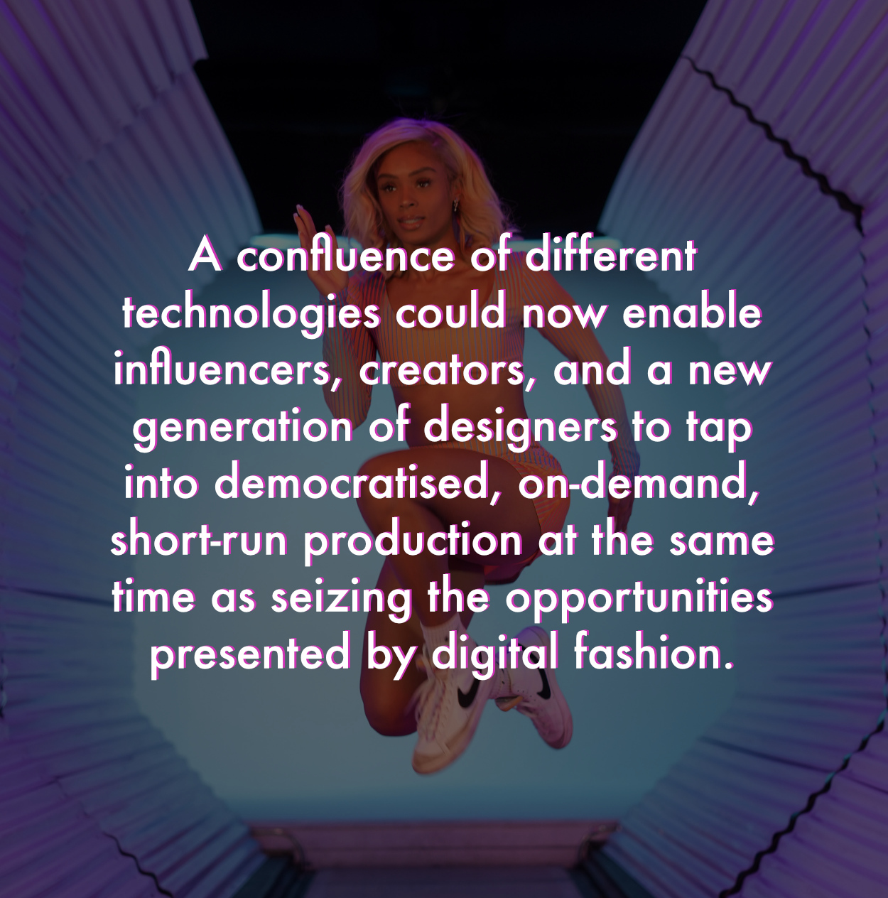 But unlike the past, where there was no other way around, a confluence of different technologies could now enable influencers, creators, and a new generation of designers to tap into democratised, on-demand, short-run production at the same time as seizing the opportunities presented by digital fashion – with the potential for a new model of fashion to emerge where the two intersect.