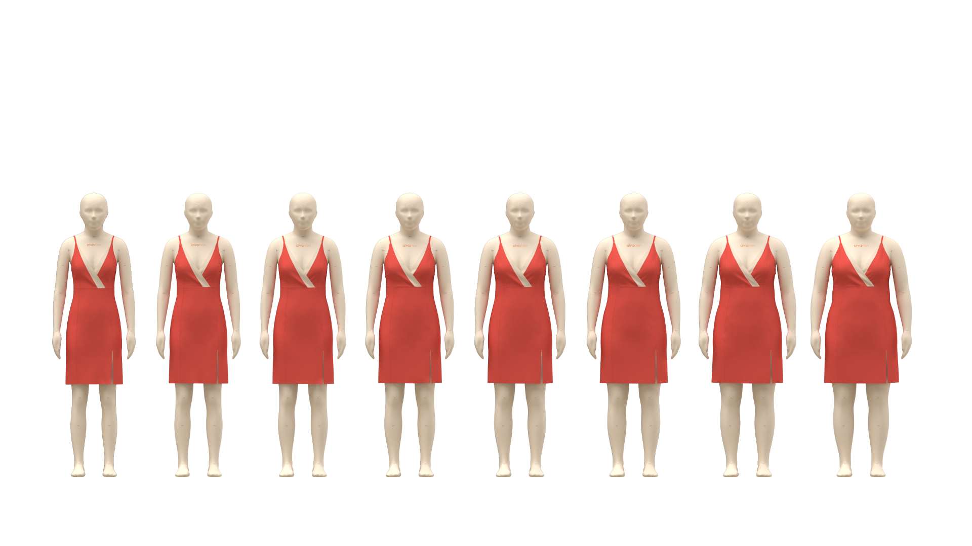 I cannot overstate the importance of a full size set, because if you have an authentic digital garment visualized in every size, you can later REUSE these assets to show your consumer how they would look in that size. Consumers want to see themselves in a similar approximation to the size that they are. In order to achieve this, you either have to photograph the actual clothing on women of varying sizes, or you create digital garments and fit them onto a size range of different avatars.