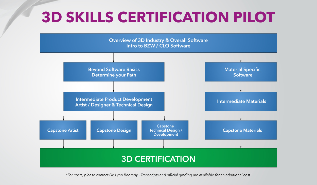 Dr Lynn Boorady, Department Head & Professor of Design & Merchandising, Oklahoma State University, is piloting a portfolio based program that utilizes a series of courses designed to help students build & demonstrate the skills required for Material Designers, 3D artists, Designers and Technical Designers. The program will officially kick off in the fall of 2023, and the courses will be presented to the Textile & Apparel Accreditation Commission to formalize the certification process.