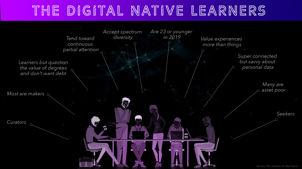 Young learners (who, according to the Institute for the Future, are considered digital natives, i.e. became young adults in 2010) on the other hand, are eager to build skills and gain experience, and know where to find answers but they sometimes need the space and time to discover their proficiencies. The good news is that educational content already exists for the most part – there is no need to reinvent it. Digital natives know where to find information but don’t always know what’s relevant and what career paths exist with the skills they already have.
