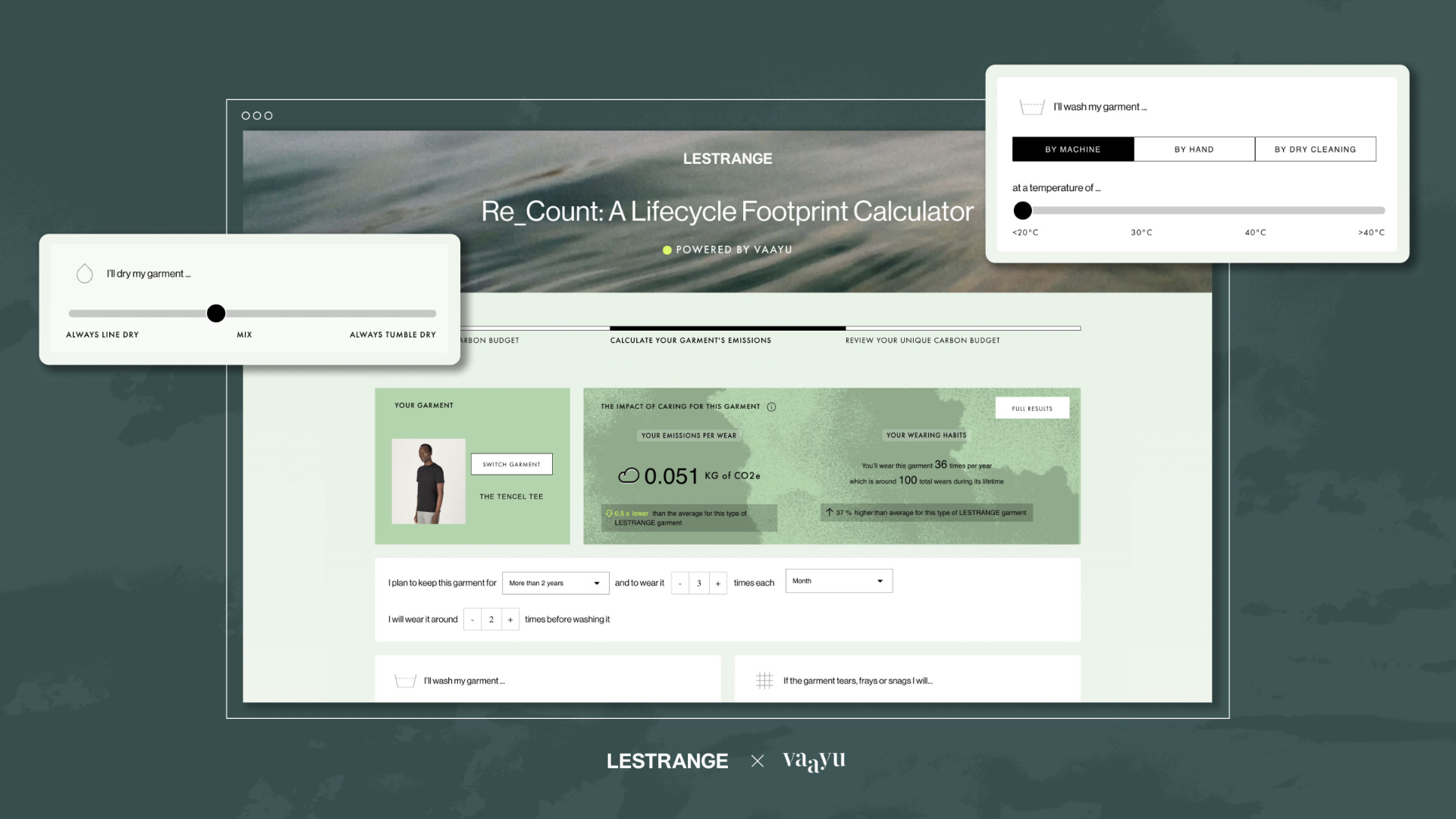 On a mission to empower customers to reduce their climate impact, London-based menswear brand LESTRANGE and climate-tech start-up Vaayu have pioneered the first automated, science-based life cycle calculator, Re_Count, to help customers see how their fashion habits impact their environmental footprint.