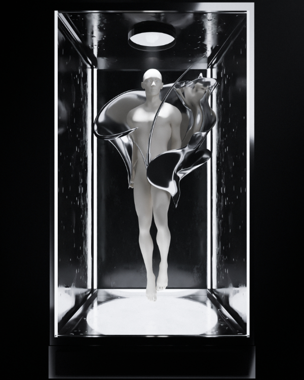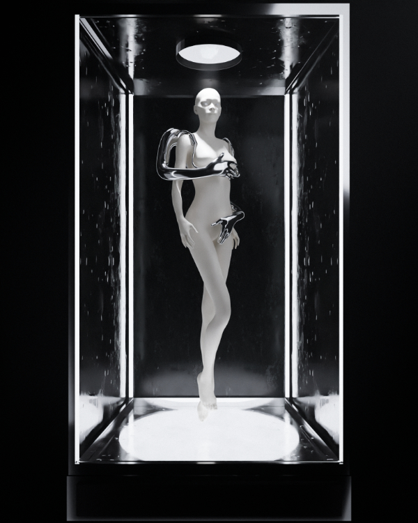 - Taskin Goec | The Last Dance: A Berlin-based mixed-reality atelier bridging the tangible and the virtual, Goec’s hybrid collection is set in a technological swamp and explores the carnal romanticism of the hyper real. To produce this collection’s designs, Goec trained a custom AI model based on his prior work and style. The looks are rich in texture, physically achieved through combinations of pleating, fraying, and printing techniques, while in the digital space, these textures are the result of intricate cloth simulations and procedural node setups. For his inaugural SYKY Collective launch, he has produced: