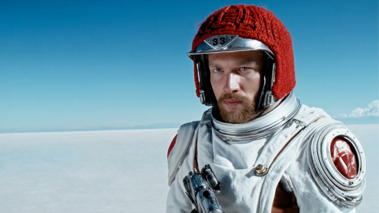 Prompt: A movie trailer featuring the adventures of the 30 year old space man wearing a red wool knitted motorcycle helmet, blue sky, salt desert, cinematic style, shot on 35mm film, vivid colors.