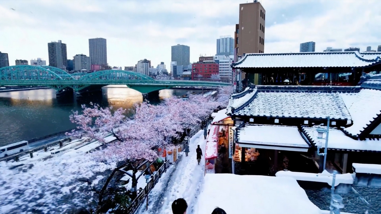 Prompt: Beautiful, snowy Tokyo city is bustling. The camera moves through the bustling city street, following several people enjoying the beautiful snowy weather and shopping at nearby stalls. Gorgeous sakura petals are flying through the wind along with snowflakes.