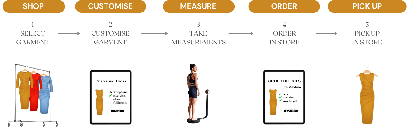 Most current in store MTM processes are designed for MTM men’s suits. This includes fabric selection, style selection and manual measurements taken by the tailor. Which is a very personal customer experience. However, in order to scale MTM production, it pays to rethink this process. By letting customers customise their garment in store on a digital configurator and have their measurements taken by a 3D body scanner. We’ll go into more detail on the customer journey considerations in the next section.