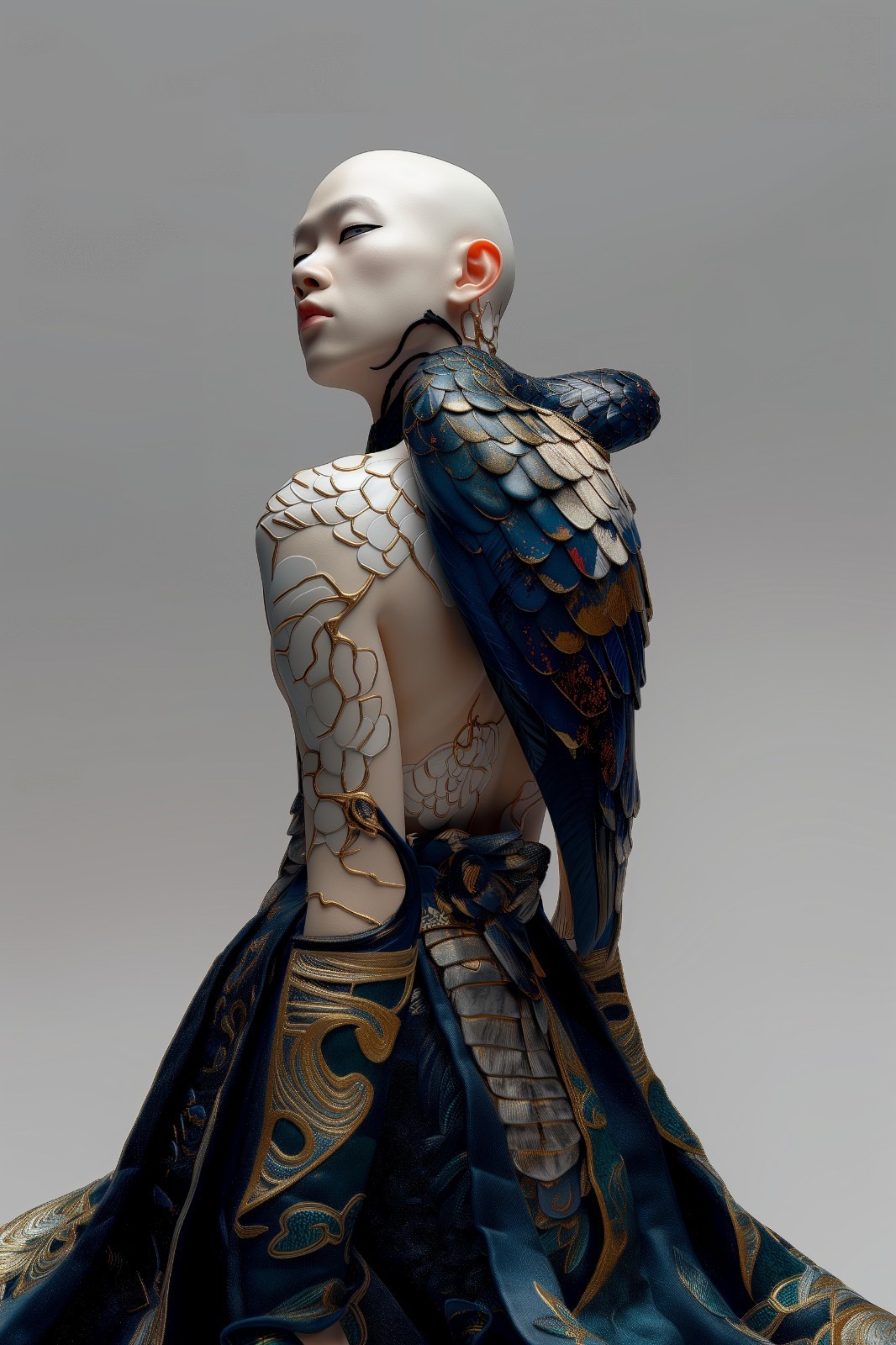 Having spent 23 years in Asia, I have been profoundly influenced by its rich cultural heritage. The tattoos on the figure’s body merge traditional art with futuristic themes, symbolizing the bridge between past and future. This fusion reflects the idea that while technology advances, it remains deeply rooted in cultural and artistic expressions. The tattoos add a layer of personal identity and storytelling to the otherwise mechanical form.