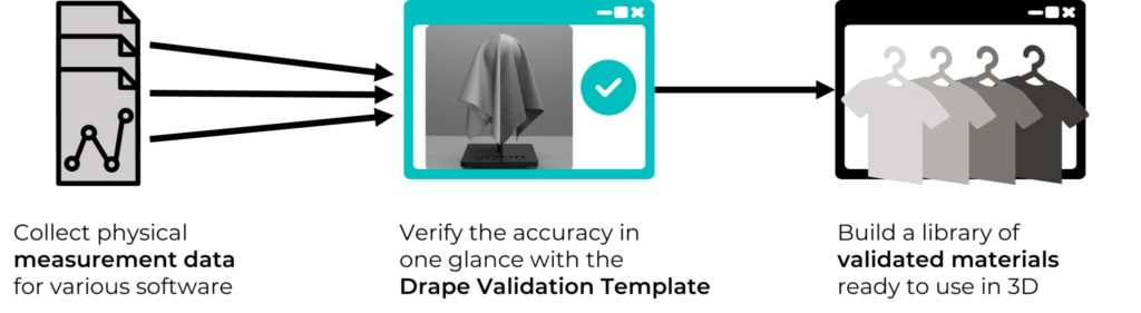 The user is trained to follow well-defined steps when draping the fabric, creating reference photographs to establish a ground truth, and rendering the digital twin under the same conditions. Then, the user documents the result in a quality control template. This allows the supervisor or the brand to judge the sample’s quality accurately at one glance.