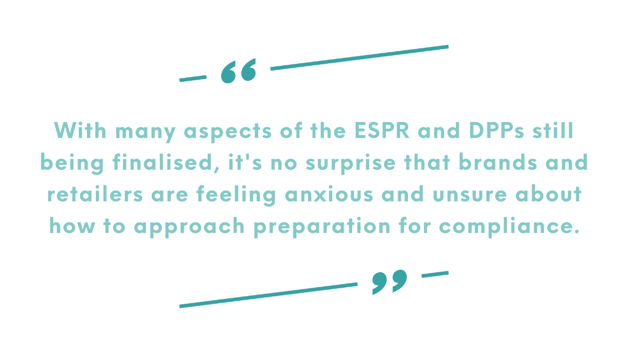 With many aspects of the ESPR and DPPs still being finalised, it’s no surprise that brands and retailers are feeling anxious and unsure about how to approach preparation for compliance. Alongside this, a lack of dedicated resources & sustainability teams makes it more challenging for brands to handle the ever-increasing compliance workload. Whilst technology can help brands become more efficient, this lack of resources can also hamper their speed to adopt and leverage new innovations, resulting in missed opportunities for optimisation. As a result, regulations seem even more daunting, making it difficult for brands and retailers to stay ahead of the curve and implement sustainable practices effectively.