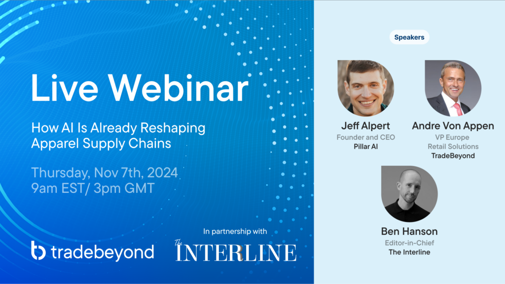 Next month, The Interline will be hosting a live, free-to-attend webinar in partnership with TradeBeyond – building on the themes of this year’s AI Report and Sustainability Report to examine how, and where, AI is transforming fashion’s supply chains.