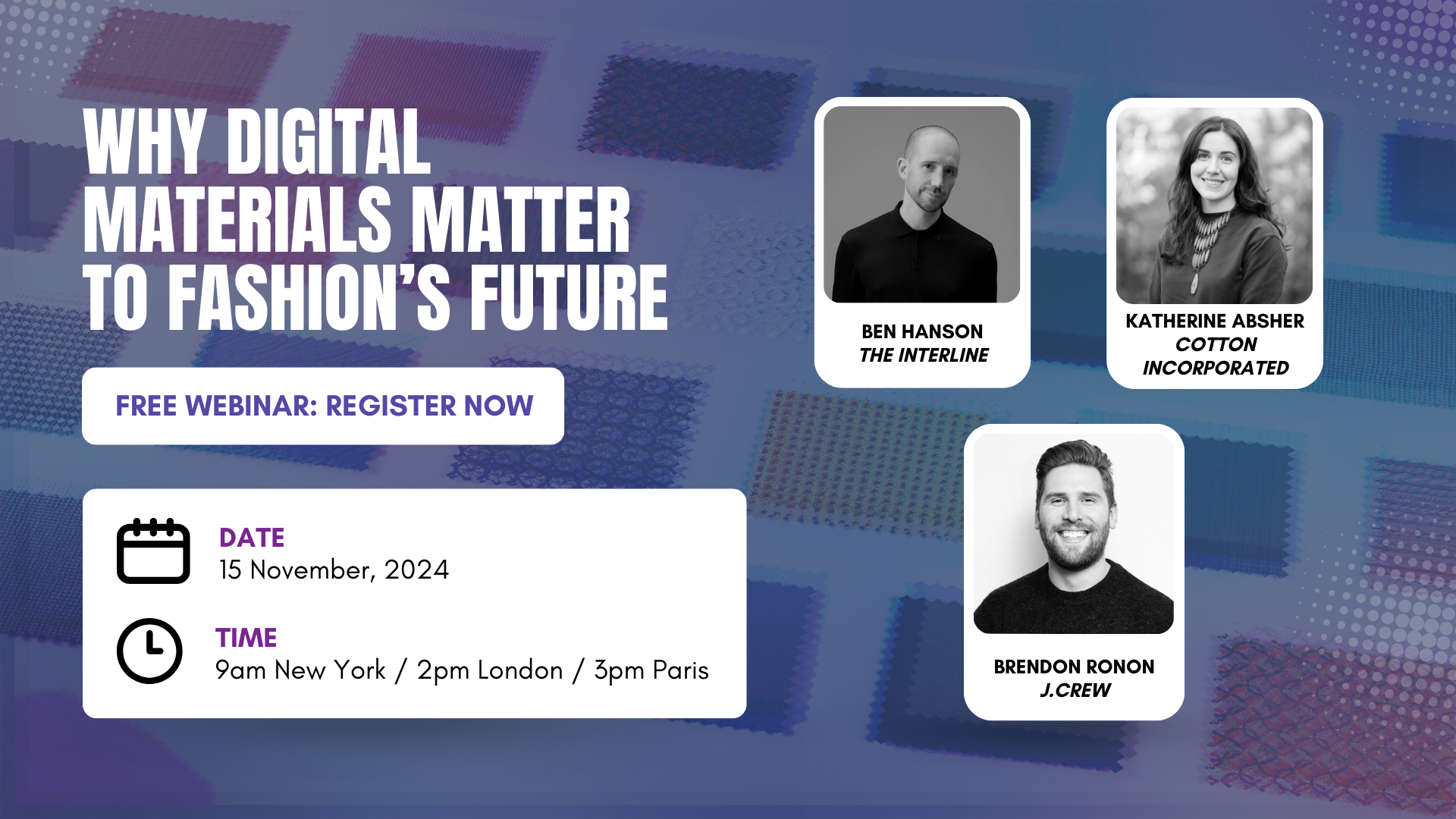 On 15th November (9AM New York time, 2PM London, and 3PM Paris) The Interline will host a one-hour webinar, in collaboration with Cotton Incorporated, and with a unique brand perspective from J. Crew, focused on the future business case for digital product creation in fashion – and spotlighting the pivotal importance of digital fabrics to wider industry transformation.