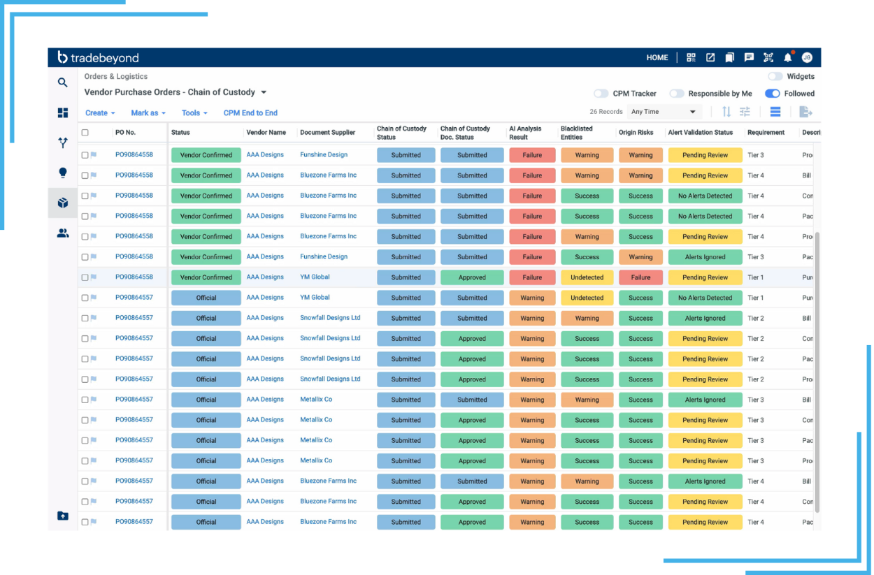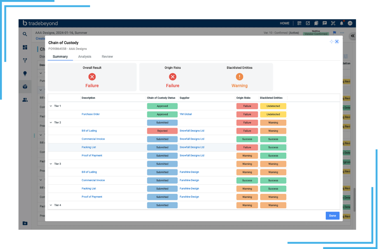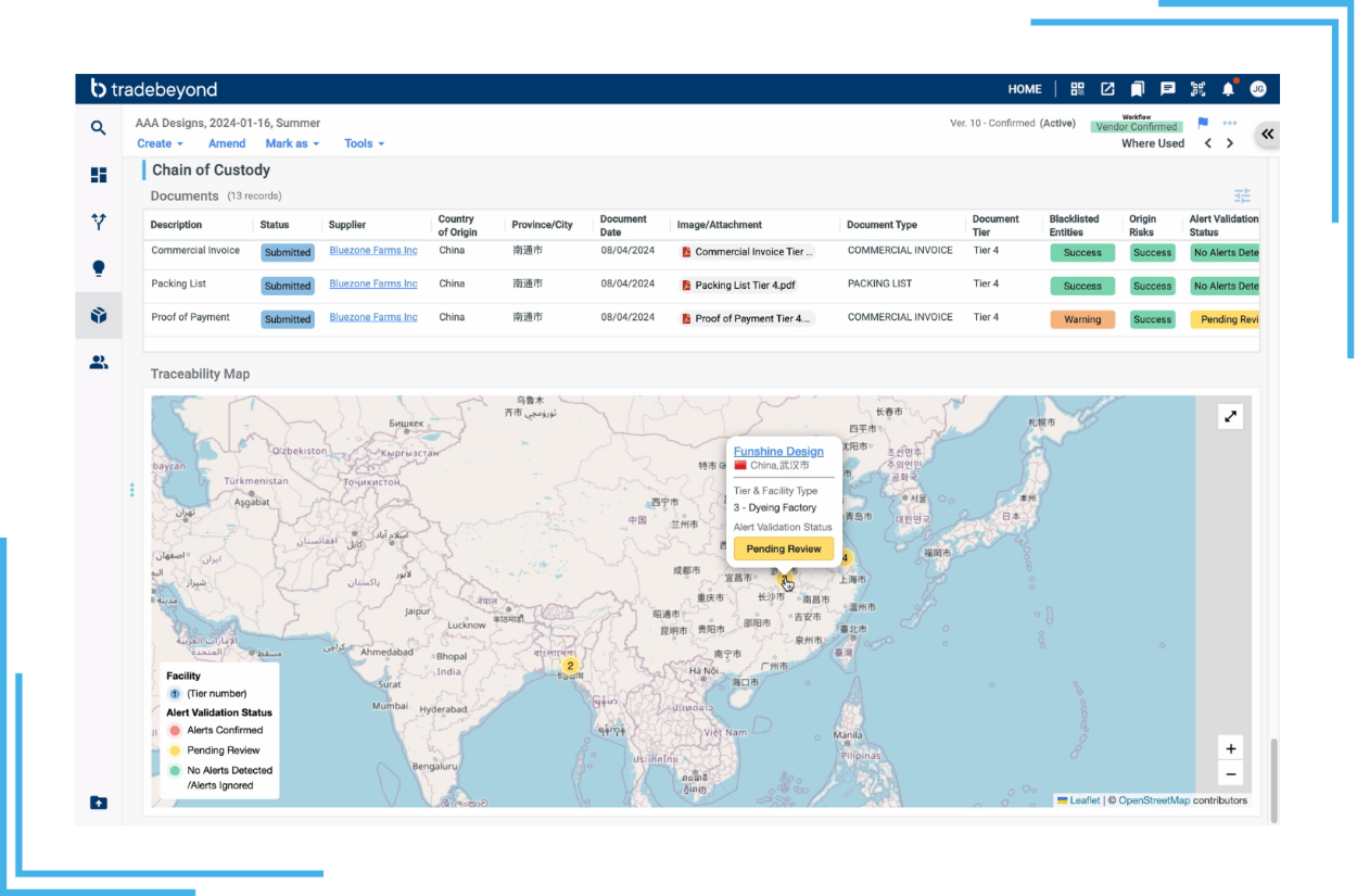 In light of regulations like the EU’s Corporate Sustainability Reporting Directive, the Corporate Sustainability Due Diligence Directive, and the U.S. Uyghur Forced Labor Prevention Act, brands must have full transparency across their supply chains, down to the raw material level. Until recently, this kind of transparency was far out of reach for most fashion retailers, but TradeBeyond has introduced first-of-its-kind AI-powered traceability tools which, coupled with our leading supplier mapping capabilities, help brands map their supply chains and create detailed chain of custody documentation for every product they source.