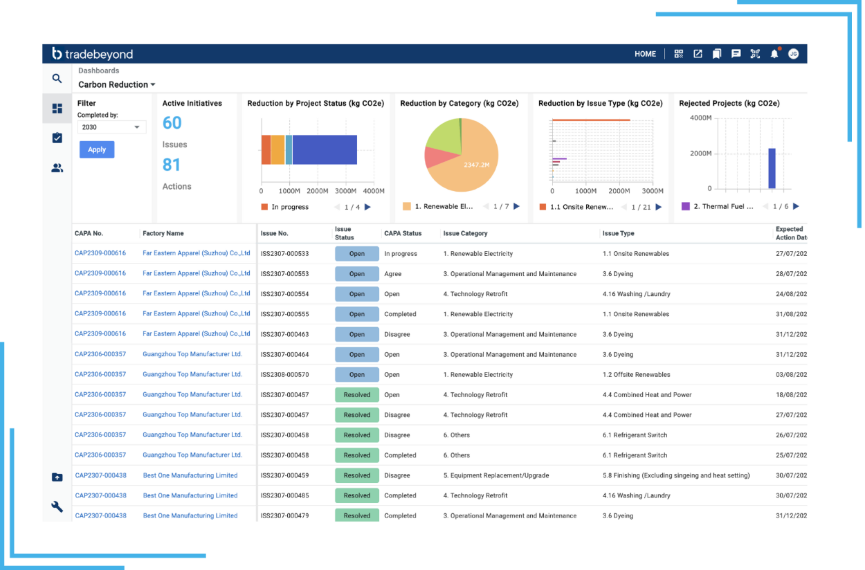 To effectively monitor and reduce Scope 3 emissions, brands need a robust data foundation. TradeBeyond’s CBX Carbon Impact tool provides a comprehensive framework for tracking and reducing supplier emissions, from energy consumption to industrial processes and wastewater. By automating data collection from suppliers and integrating it into a centralized platform, CBX Carbon Impact simplifies the management and reporting of Scope 3 emissions, ensuring compliance and transparency. Its interactive dashboards centralize data for easy access, offering insights into energy efficiency and emission reductions to help meet targets. The platform also supports corrective action plans, enabling brands to collaborate with suppliers on improving efficiency and reducing emissions.
