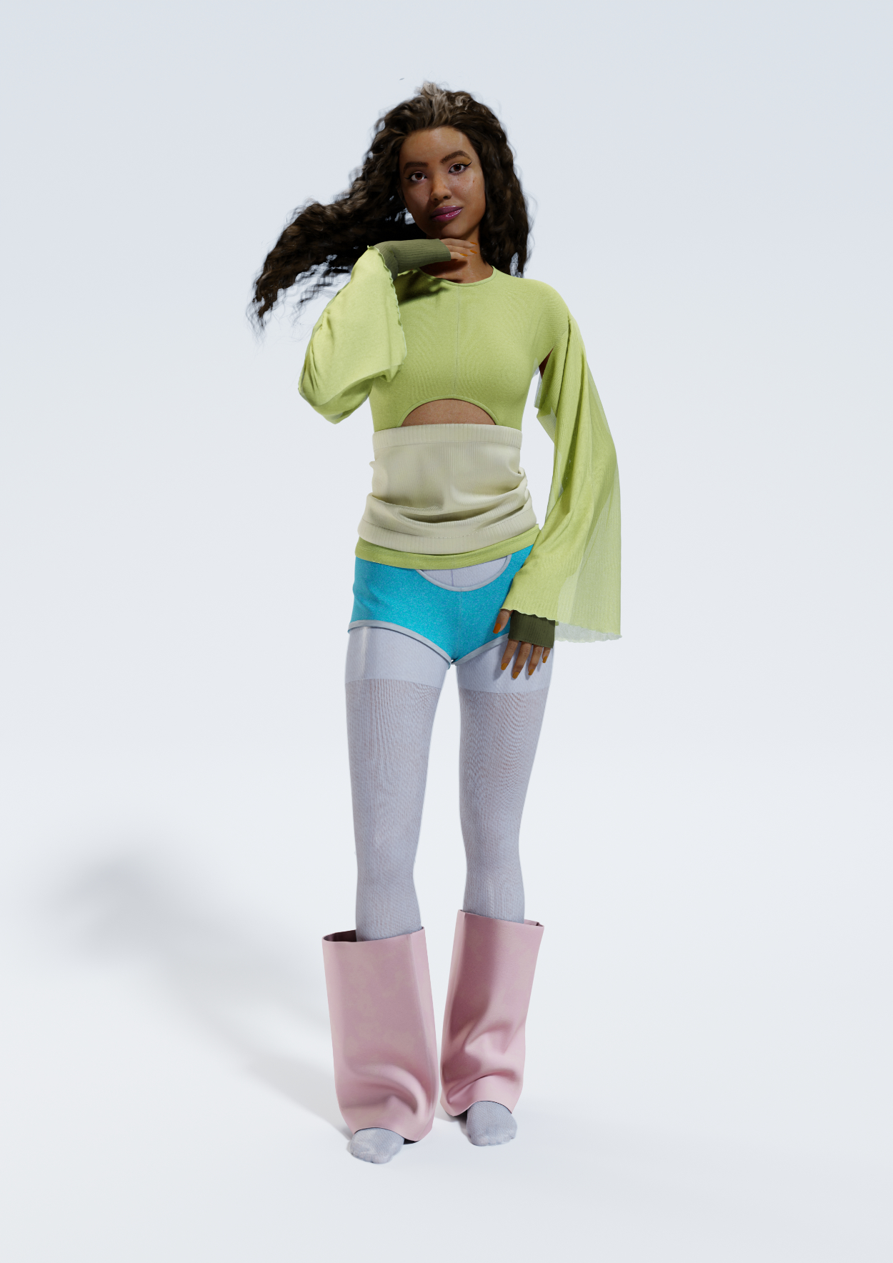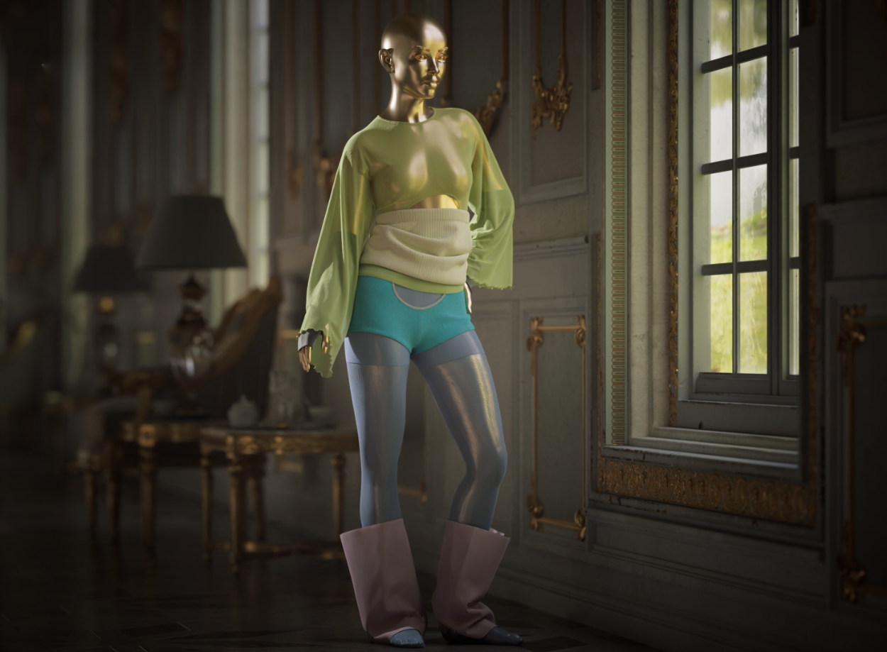 The Interline: We’re spotlighting your designs in two different ways: one using your own software pipeline and workflow, and the other taking advantage of the link between CLO and Unreal Engine to showcase how the same designs and the same materials can be used to tell the same story from different angles. Let’s start with your own renders: tell us what tools and processes you used to create, pose, stage, and generate those final pixels.