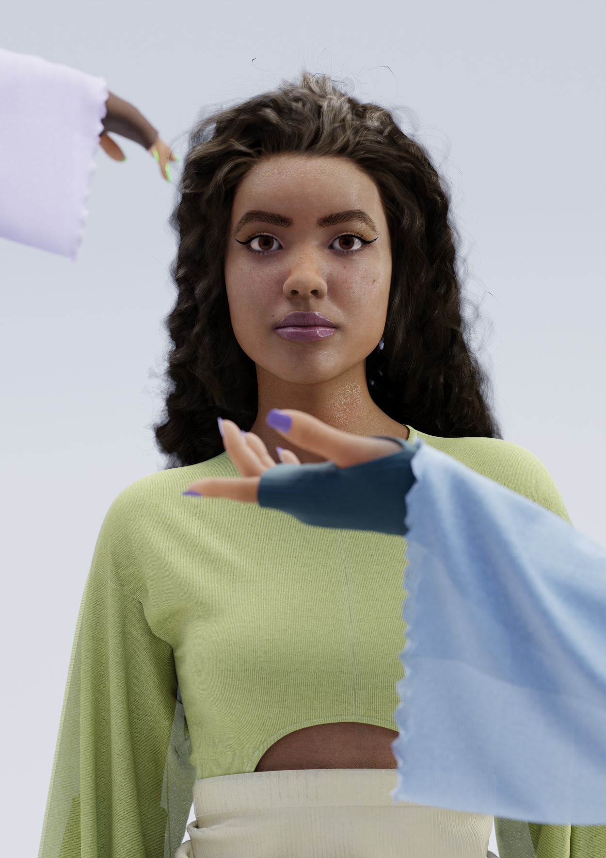 Diane Wallinger: Traditionally, fashion has always been influenced by external factors and I believe that digital fashion imagery has a similar ability to mirror or respond to the zeitgeist. We are going through troubled and uncertain times, and I wanted to reflect on a need to balance this out with comfortable clothing, protective layers and softening colours and materials. Sometimes braving a complex geo-political climate starts with putting on a comfy sweater and I think that even digital-only imagery can convey such feelings.