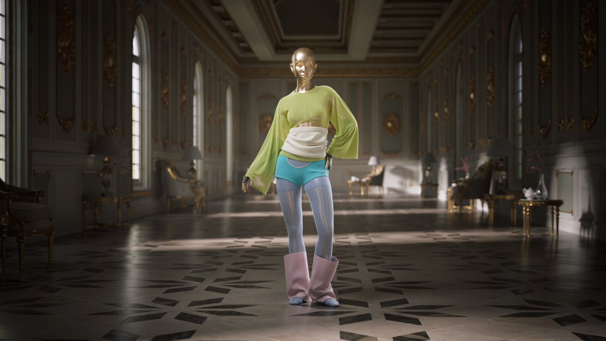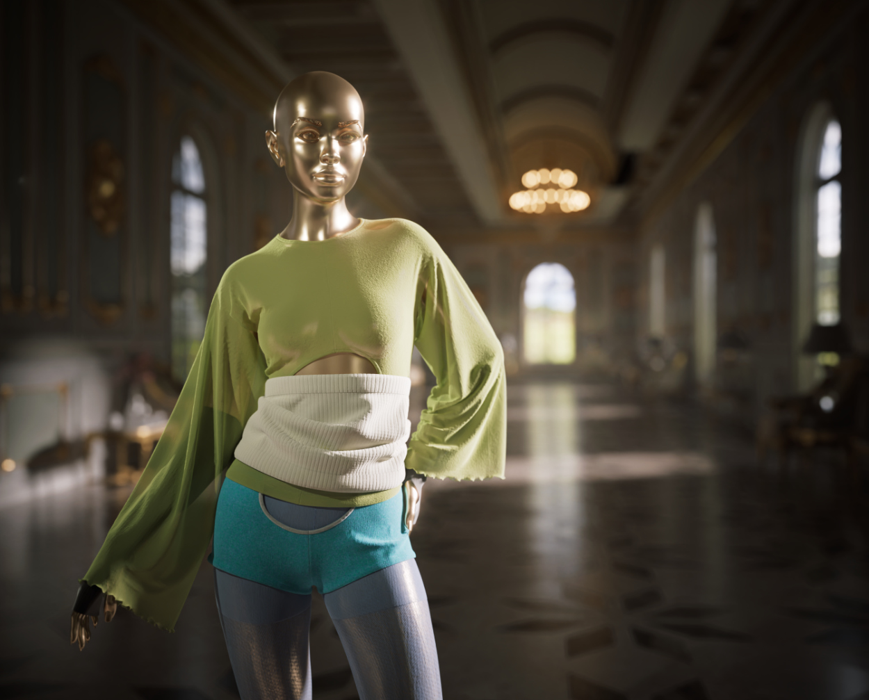 To work with this project I made a few adjustments, like removing pillars from the original piece to create a more open space. The ornate hallway became the perfect setting for a digital fashion shoot.