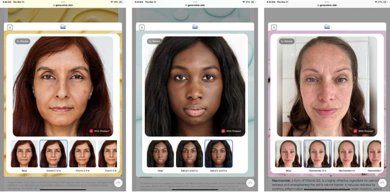 The same company is also launching Generative Skin for consumers, allowing them to explore how skincare ingredients impact their skin. Users upload a photo to receive what the company calls “realistic” visualisations of how ingredients like retinol or Vitamin C might address concerns such as pigmentation, redness, and breakouts.